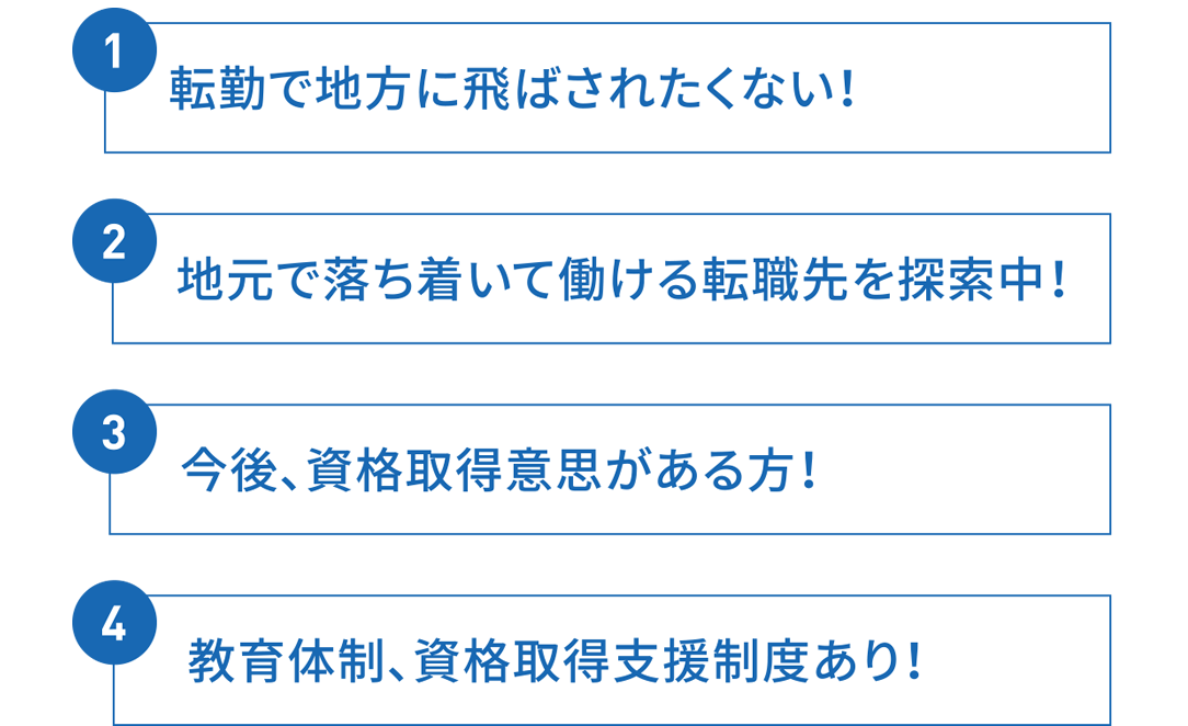 | 資格 | 普通自動車免許(AT限定OK) ※施工管理2級以上、施工管理として公共工事に携わった経験のある方優遇! ※資格が無くても、公共工事における現場監督のサポートなどの経験がある方はご相談ください。 |
